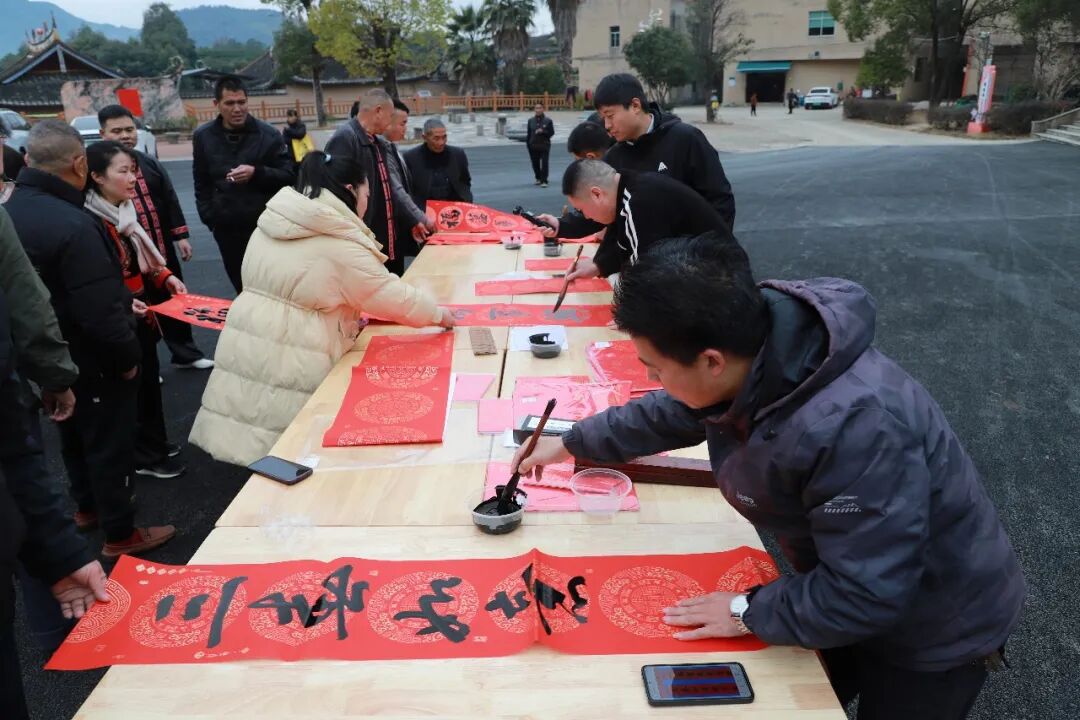 与此同时,爱心义剪与春联送福两大惠民服务区村民们络绎不绝。在义剪区,专业的理发师志愿者手法娴熟,细心为前来理发的村民修剪发型,让大家以崭新的面貌迎接新年。一旁的春联区内墨香四溢,书法爱好者们挥毫泼墨,一幅幅充满吉祥寓意的春联和“福”字跃然纸上,吸引了众多村民驻足欣赏、免费领取,现场欢声笑语,年味十足。期间,市委宣传部为金斗洋村村民们送上乡镇经费和新春祝福。