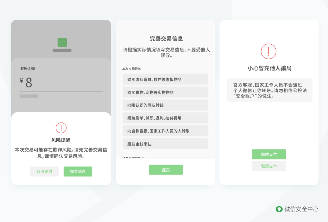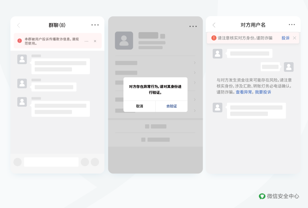 这些诈骗行为严重影响微信用户的合法权益,破坏平台的生态环境。一直以来,微信持续对平台内发生的各类欺诈行为进行重点关注、坚决处理、严厉打击。根据国家相关法律法规及《腾讯微信软件许可及服务协议》《微信个人帐号使用规范》,在核实用户投诉提交的证据后,对确认存在欺诈行为的帐号,微信方面将视其违规程度,进行功能限制、帐号封禁等阶梯式处理;对确认欺诈的支付账户进行冻结等处理。2023年以来,微信共计对35312个确认存在欺诈行为的帐号进行了阶梯式处理;对10896个确认存在欺诈行为的微信群进行了限制群功能(封群)处理。微信方面表示,后续仍将加强对网络诈骗行为的处理。同时,平台会依法配合公安机关开展相关工作,进一步打击作恶团伙。据悉,对有可能发生风险的场景,微信系统会提前对用户进行安全提示。大家在使用微信过程中遇到系统的安全提示时,请务必提高警惕,仔细核查对方身份,谨防诈骗。1. 涉及转账、汇款等资金交易,务必通过电话、视频等方式仔细核实对方身份,谨防诈骗。2. 当遇到微信发出的各类安全提示时,提高警惕和防范意识,不轻易转账、汇款,不轻易泄露个人信息。3. 不扫描不了解的二维码,不随意点击未知链接,不下载安装来历不明的APP,不轻易泄露自身各类密码和短信验证码,不轻易给陌生人开启手机、电脑屏幕共享功能。4. 当遇到诈骗或者可疑情况时,请及时进行投诉。如有金钱损失,请马上报警。微信方面表示,对利用微信实施欺诈行为的帐号,一经确认,将对违规帐号进行梯度处罚直至封停处理,并将审核结果反馈至投诉用户。1. 投诉个人用户:微信对话窗口➛右上角…➛投诉➛选择投诉该帐号的原因➛提交投诉证据。2. 投诉微信群:微信群聊窗口➛右上角…➛投诉➛选择投诉该群的原因➛提交投诉证据。3. 通过小程序举报:搜索“腾讯卫士”小程序➛网络诈骗➛举报帐号➛填写举报内容➛点击“提交”即可。来源:微信安全中心