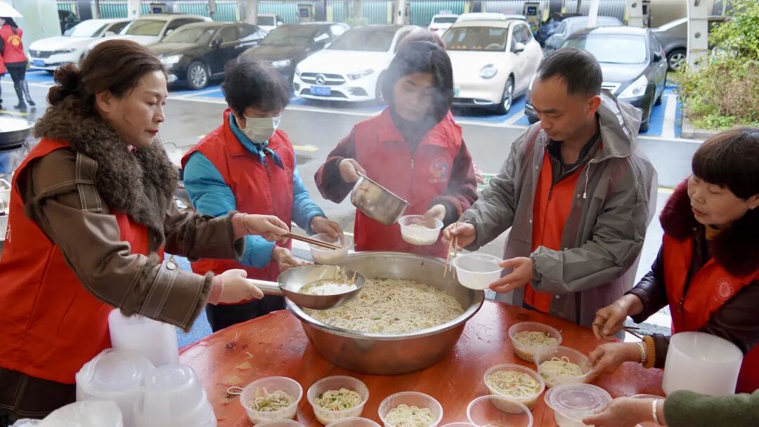 在社区孝老食堂,志愿者们一早就开始忙碌,集中制作爱心粉干。从选材、清洗到烹制,大家严格把控每一道工序,并第一时间将热腾腾的粉干送到独居空巢老人、残障居民等特殊群体家中。每到一户,志愿者们都细心询问生活状况和实际需求,耐心叮嘱日常注意事项,用贴心服务传递温暖关怀。
