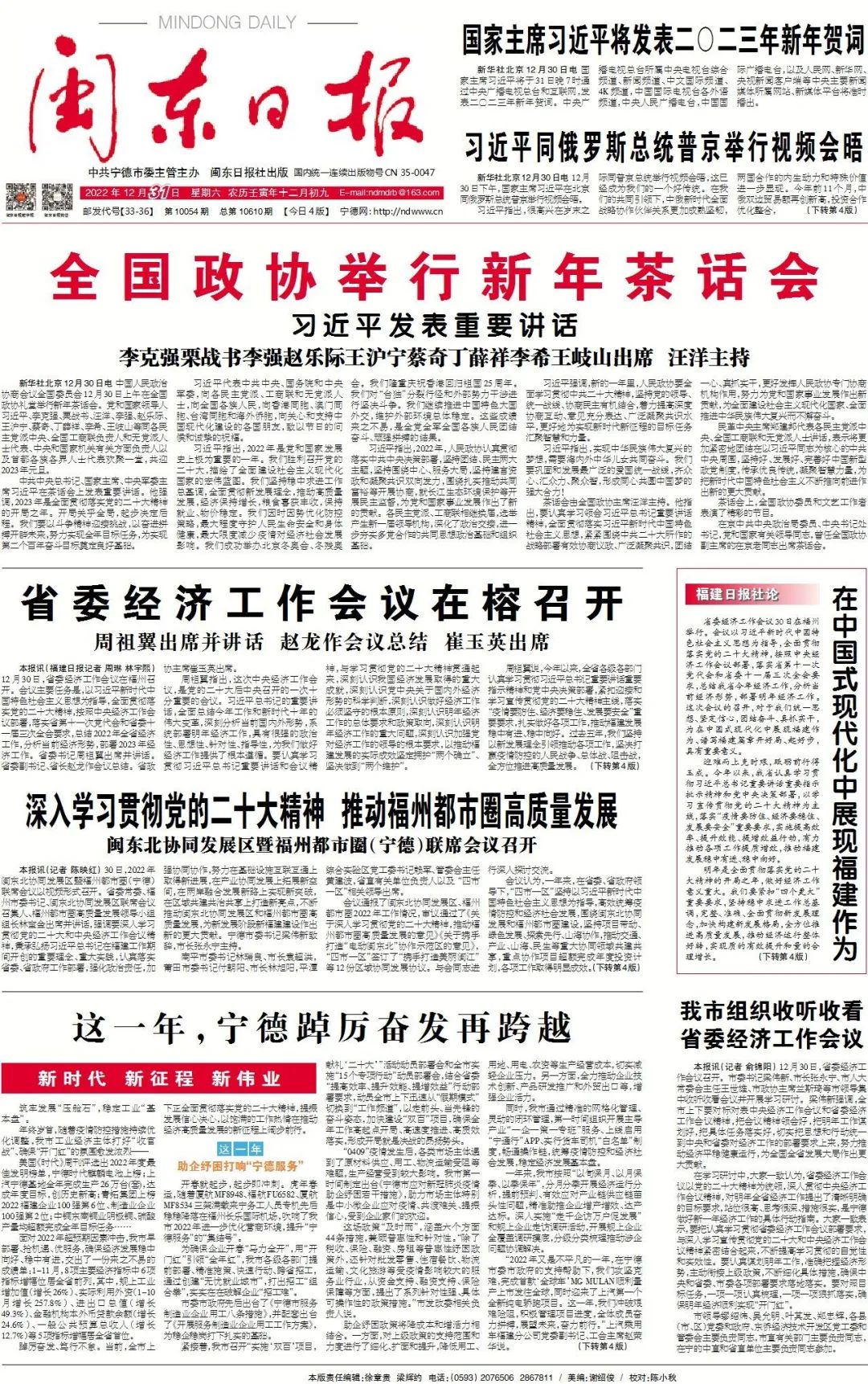 美国《时代》周刊评选出2022年度最佳发明榜单,宁德时代麒麟电池上榜;上汽宁德基地全年完成生产26万台(套),达成年度目标,创历史新高;青拓集团上榜2022福建企业100强第6位、制造业企业100强第2位;中铜东南铜业阴极铜、硫酸产量均超额完成全年目标任务……