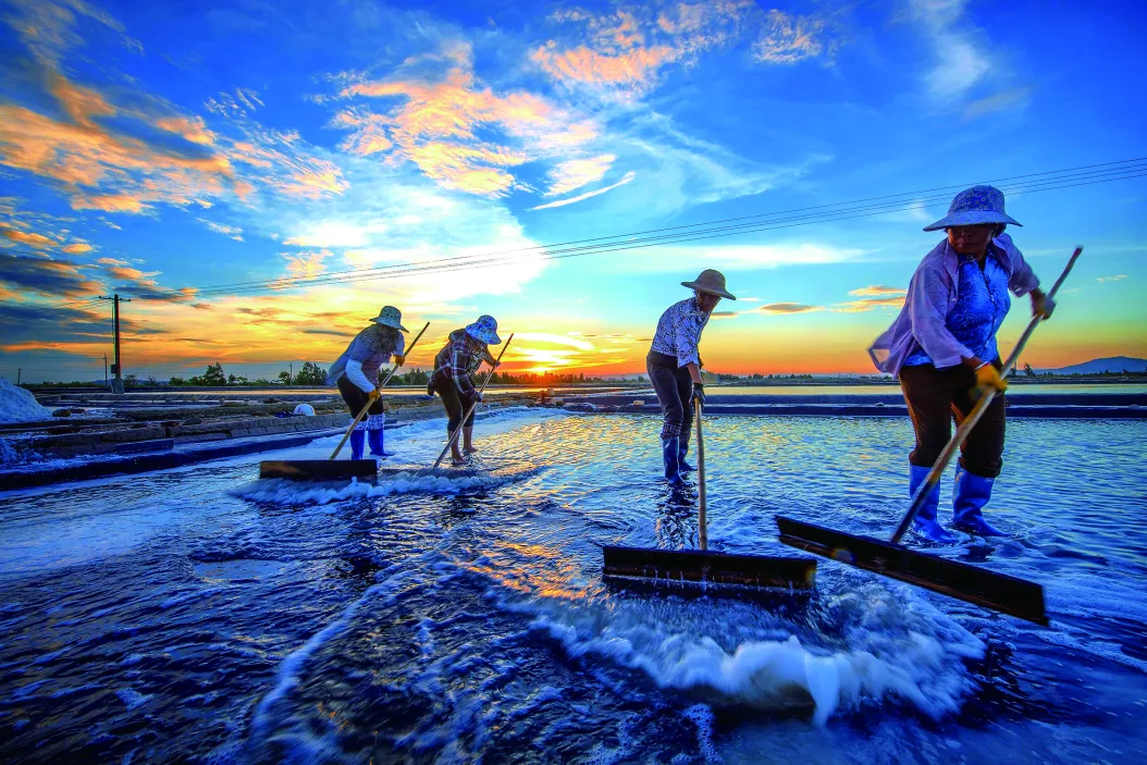莆田东峤盐场的女工们用耙子将析沉在结晶池底的盐扒成一堆。(王福平 摄)