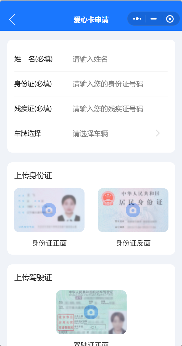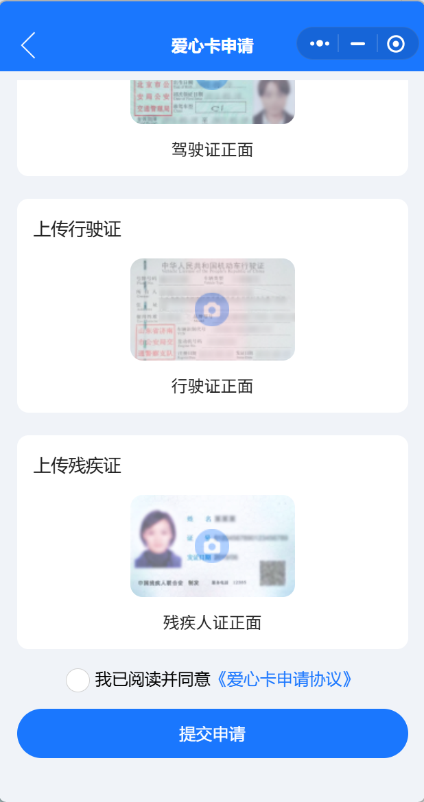 三、点击申请,根据系统要求,上传本人身份证/行驶证/有效残疾人证,后台工作人员审核通过后自动生效。