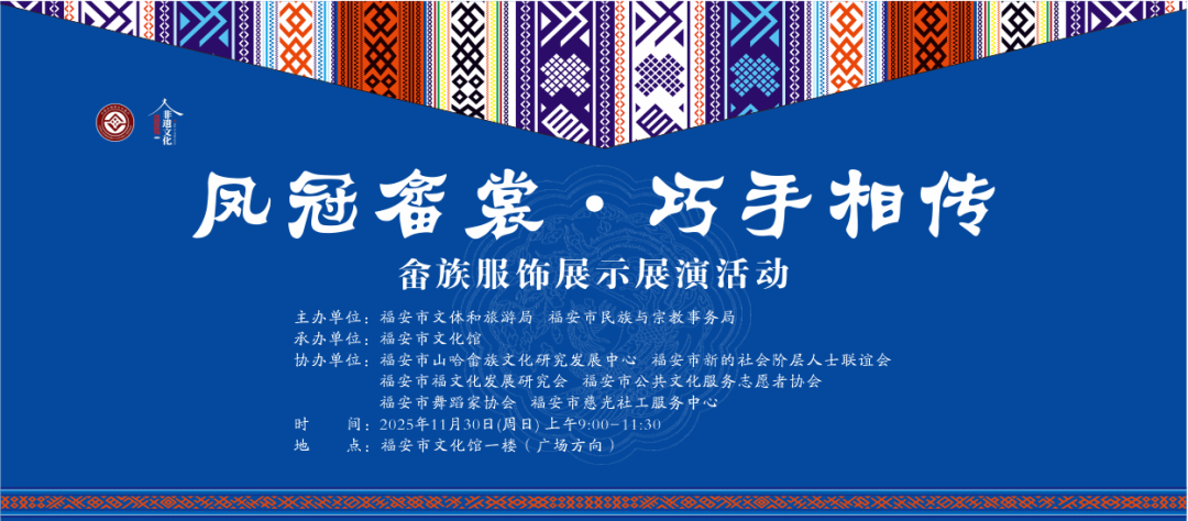11 月 30 日(周日)上午 9:00,由福安市文体和旅游局、福安市民族与宗教事务局主办,福安市文化馆承办,福安市山哈畲族文化研究发展中心、福安市新的社会阶层人士联谊会、福安市福文化发展研究会、福安市公共文化服务志愿者协会、福安市舞蹈家协会、福安市慈光社工服务中心协办的“凤冠畲裳・巧手相传” 畲族服饰展示展演活动重磅来袭,邀您一起共赴非遗之约~