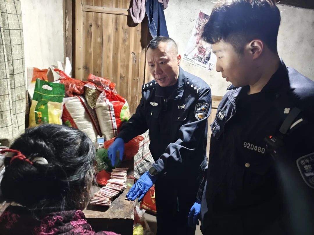 钟某坚称钱就锁在箱子里,两天前她还见到。民警一边耐心地安抚心急如焚、哭得像孩子的钟某,一边仔细地对现场进行勘查,并对周边进行了调查取证。派出所和刑侦民警通力合作,现场初勘结束,房屋门锁以及箱子的锁均未有被撬动痕迹,门窗也无攀爬痕迹。民警们初步分析,排除入室盗窃。如果真有这笔钱的话,可能是老人年事已高,忘记了财物的放置位置。于是,征得钟某以及其子女的同意后,民警在其他村民的见证下,又经过十几分钟的翻找,民警在一个挂在墙上的蛇皮袋中找到了几十个大大小小、层层包裹的塑料袋,打开后,民警发现了一沓沓的现金,因存放时间较久,散发着霉气。