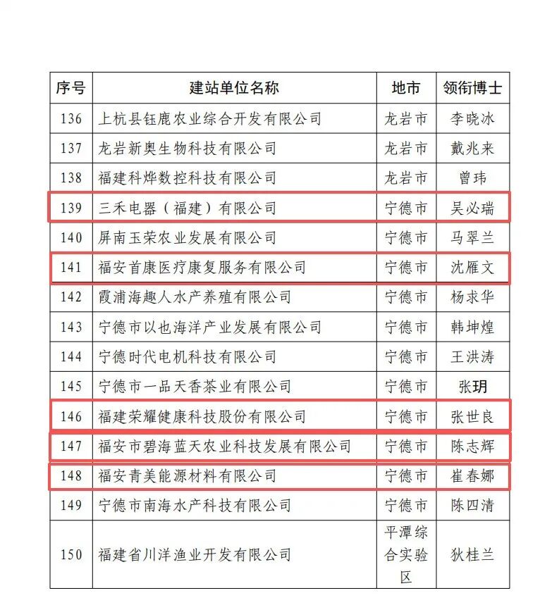 近日,福建省公布2025年新增省级博士创新站名单。其中,三禾电器 (福建) 有限公司、福安首康医疗康复服务有限公司、福建荣耀健康科技股份有限公司、福安市碧海蓝天农业科技发展有限公司、福安青美能源材料有限公司5家福安企业入选,涵盖智能制造装备、医疗卫生、健康科技、现代农业技术、新能源材料等重点领域,新增数量位宁德市第一。
