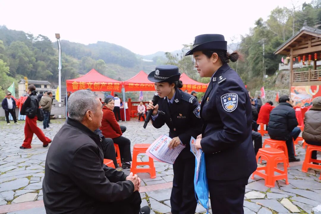 现场还设置了反诈与交通安全宣传专区,公安民警通过发放宣传单、现场讲解等方式,向群众普及防范电信网络诈骗及文明出行知识,结合案例提醒大家守好“钱袋子”、平安出行。此外,蚕丝制品、畲族文创产品展示、畲族旅拍等民俗互动体验也为活动增添了浓浓的民族文化与欢乐气息。
