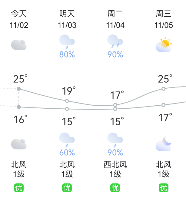11月2日:阴天到多云,夜晨局部有小雨。东北风2~3级,沿海东北风4~5级,阵风6级。火险2级,可燃。气温18~24℃。