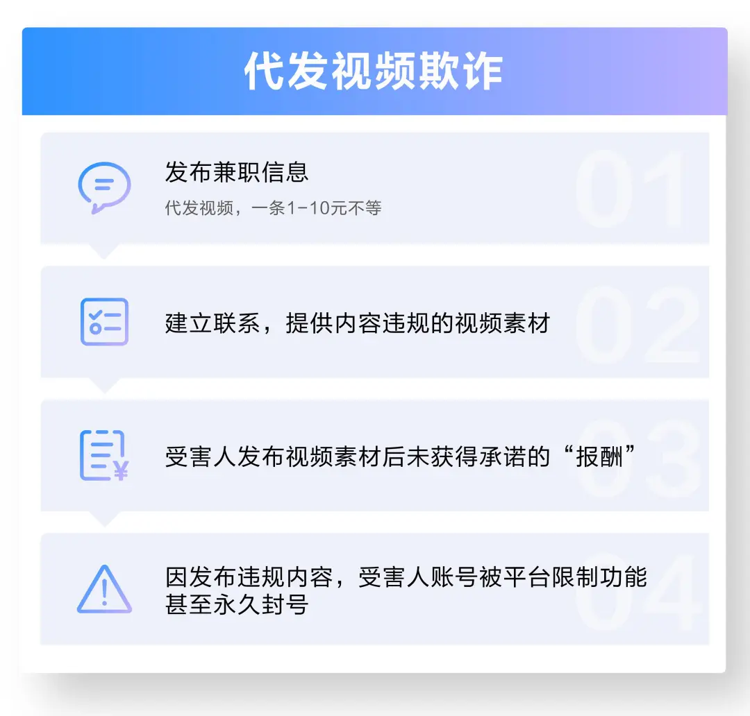 近期平台发现,有部分账号集中在私信、群聊内发布兼职招聘信息,涵盖刷单、点赞、代发视频等多种类型,与受害人建立联系后,通过小额报酬,诱导对方在第三方App持续转账、充值,最终使人遭受财产损失。