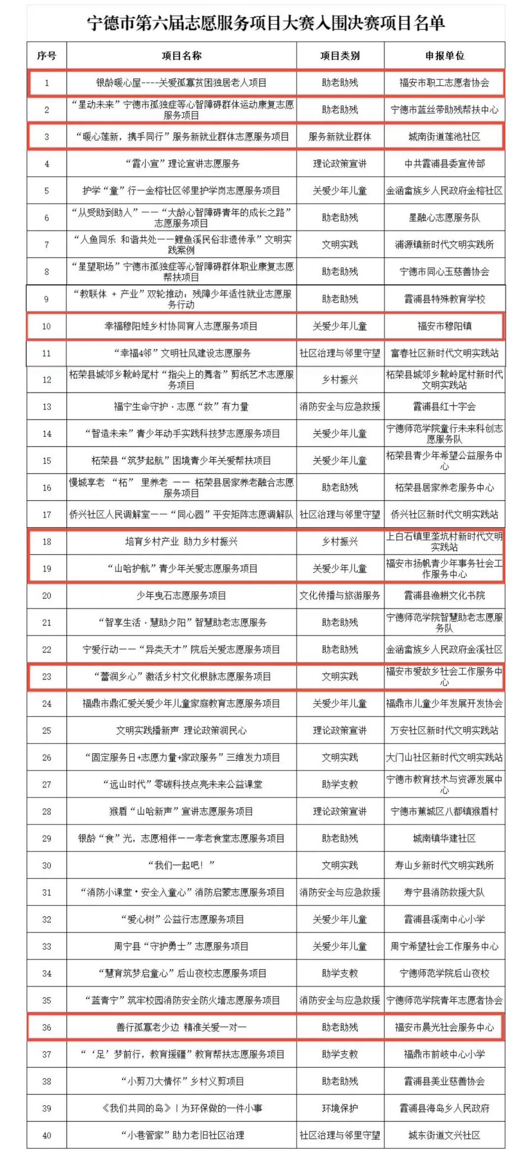 根据《中共宁德市委社会工作部等五部门关于举办宁德市第六届志愿服务项目大赛的通知》(宁委社〔2025〕44号)要求,组委会前期组织专家对各县(市、区)、市直单位推荐的参赛项目进行初评,共评选出40个入围决赛项目,现予以公示。公示时间从2025年10月17日至10月23日,公示期为5个工作日。在此期间,欢迎广大干部群众通过来电、来信等方式向宁德市第六届志愿服务项目大赛组委会提出意见。