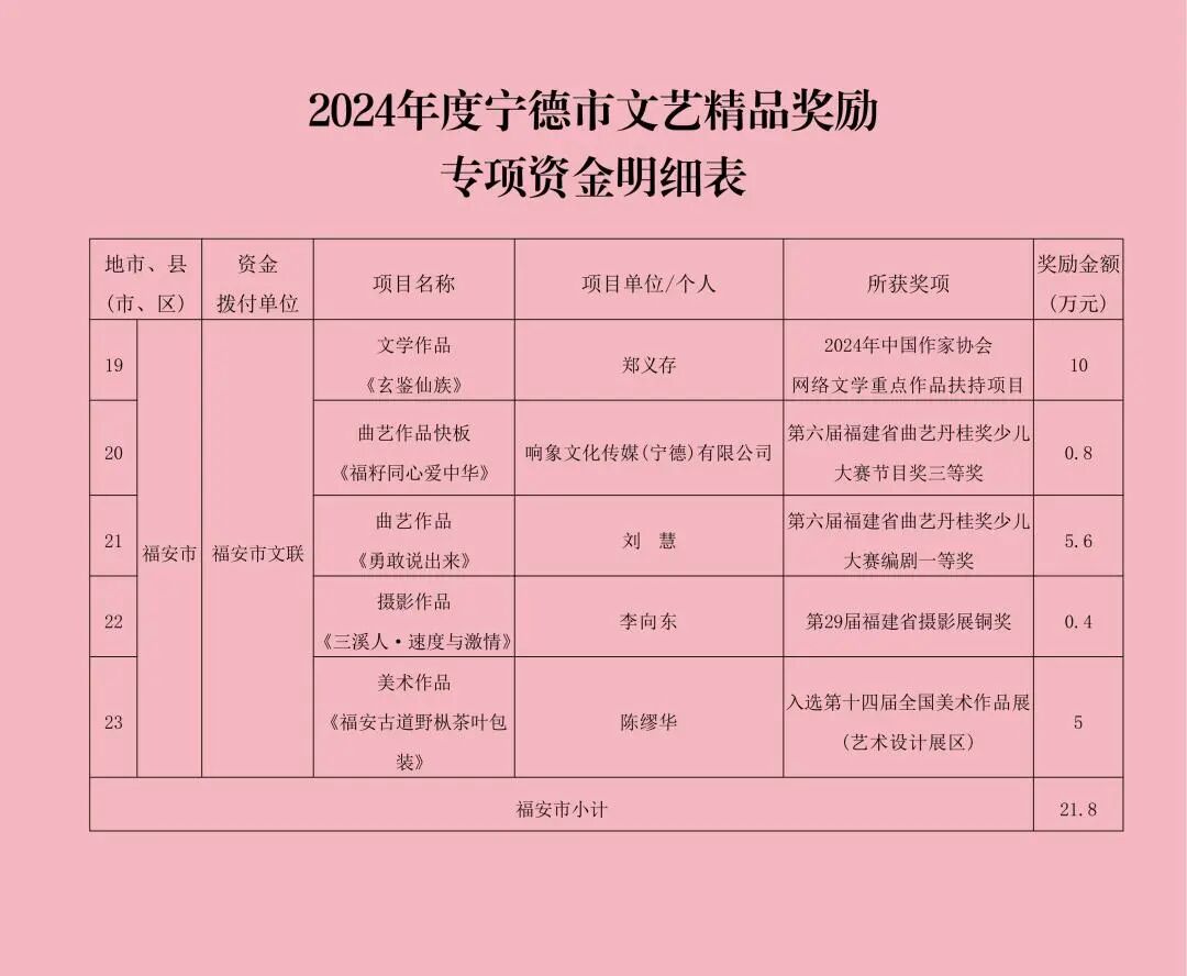 近日,2024年度宁德市文艺精品奖励评选结果揭晓,福安市文联组织申报的5个作品入选,获奖金额达21.8万元。福安文联申报的获奖作品在数量、文艺门类和奖金总额等方面,均位居宁德各县(市)文联系统首位。
