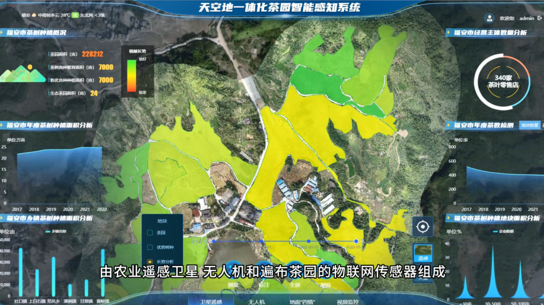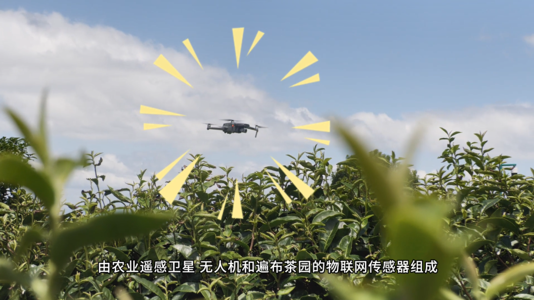 我们的5G智慧茶园是“天、空、地一体化”数字种植体系,由农业遥感卫星、无人机和遍布茶园的物联网传感器组成。通过这些设备我们能实时监测这1800亩茶园的气候、土壤墒情、养分和病虫害这些关键数据。