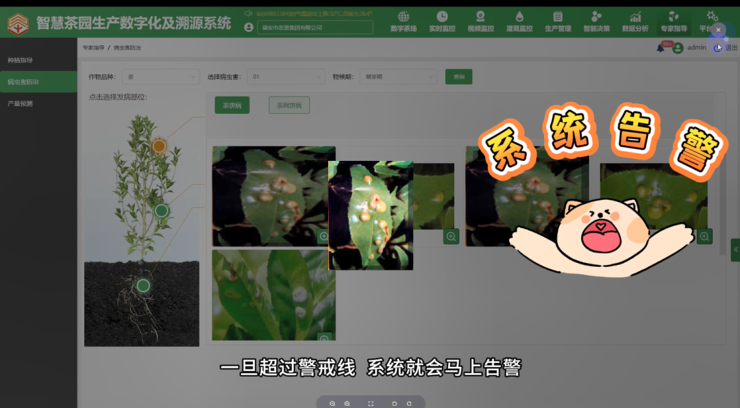 除了智能虫情测报系统,5G智慧茶园还涵盖了环境智能监测及识别系统、智能灌溉系统、可视化视频监控系统、茶产品溯源等八大系统。这些信息在这面显示屏上都清晰可见。技术人员只要点击鼠标,就可以通过模型算法进行成长预测、灾害预警和施肥方案制定,为这1800亩茶园装上了“最强大脑”。