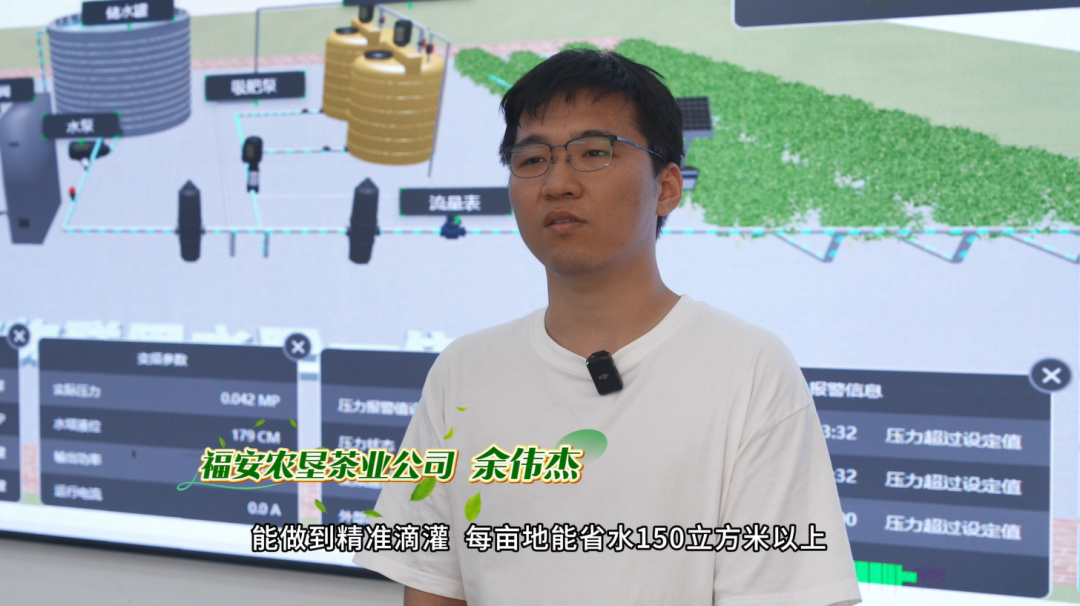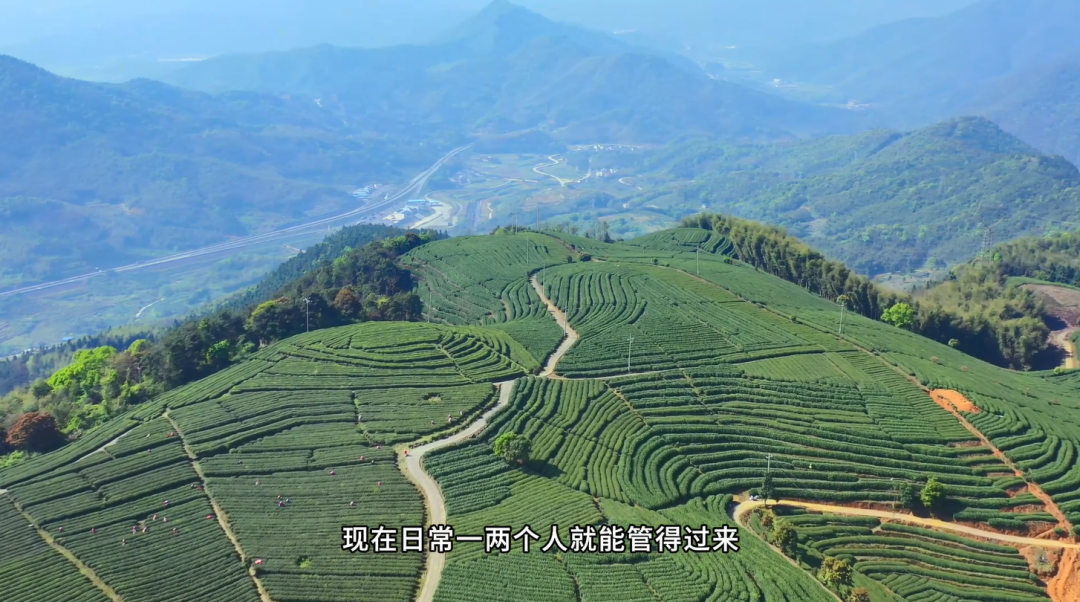 比如我们的水肥一体化系统,能做到精准滴灌,每亩地能省水150立方米以上,节约肥料40%–50%。管理效率也大大提高。这1800亩的茶园,原本需要十来个人管理,现在日常一两个人就能管得过来。算下来,每亩一年能多赚1380元左右,真正实现了精准高效。
