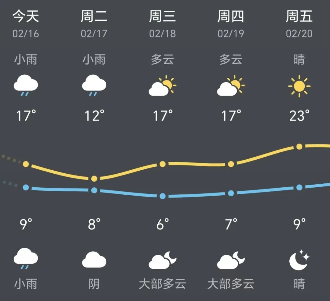 2月17日:阴有小雨。偏北风2~3级,沿海偏北风5~6级阵风7级。