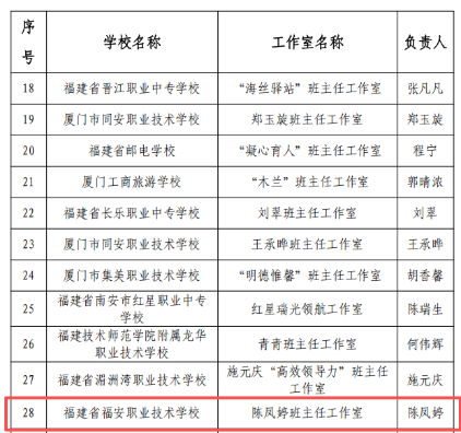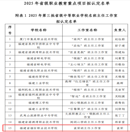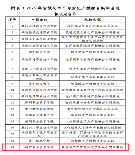 11月12日,福建省教育厅公布2025年省级职业教育重点项目拟认定名单,福建省福安职业技术学校四个重点项目入围。其中,该校新能源汽车智能网联产教融合实训基地入围2025年省级高水平专业化产教融合实训基地;该校陈凤婷班主任工作室、林巍立班主任工作室、袁荣班主任工作室入围2025 年第三批省级中等职业学校名班主任工作室。