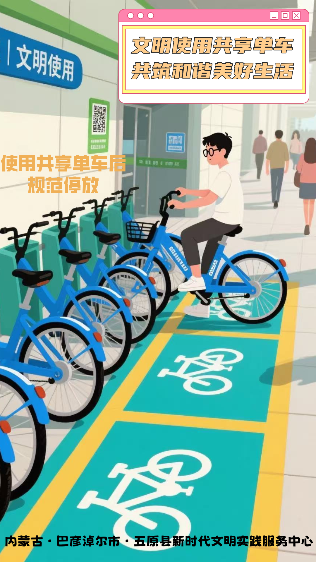 遵守社会公德,不随意停放、不乱停乱放、不恶意损坏、不乱贴乱画、不将共享单车占为私有。