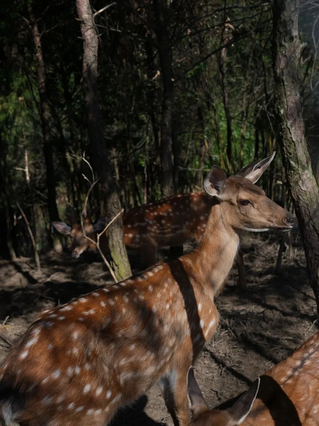 阳光透过树叶洒在鹿群身上