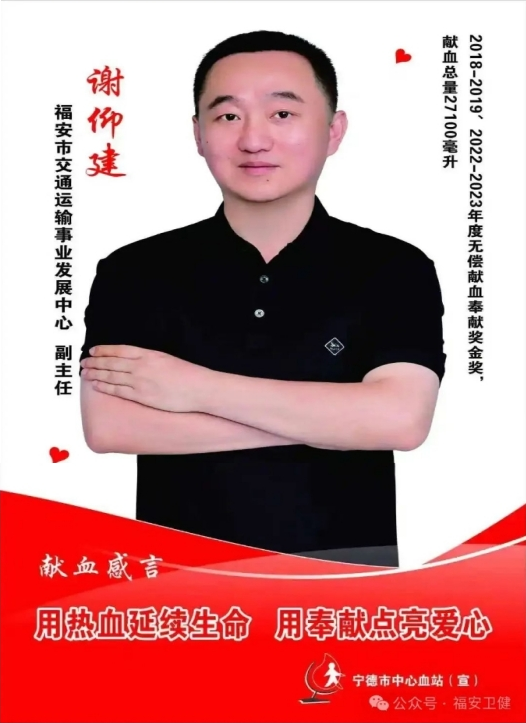 福安市交通运输事业发展中心的谢仰建,是一名退伍十五年的老兵。十五年来,他累计献血114次,献血总量达39260毫升,相当于8个成年人全身血液的总和。日复一日的坚持,让他在公益路上踏出温暖而坚实的足迹;汩汩流淌的热血,无声书写着一名老兵的担当。他,是献血现场最动人的榜样。