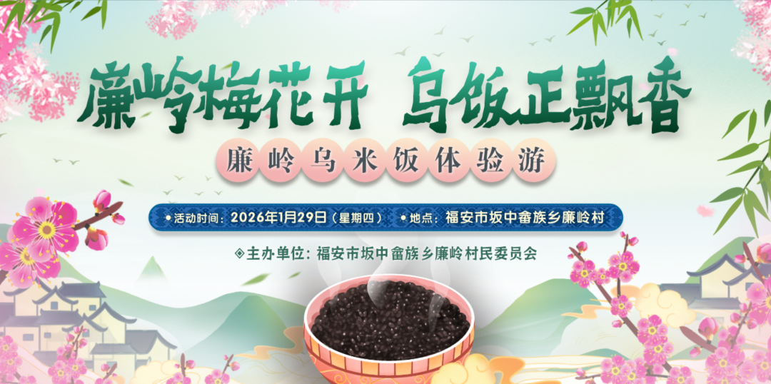 福安市坂中畲族乡廉岭村——这座藏着300年畲族风情的古寨,梅花盛开季节,以乌米饭为媒,邀你解锁 “非遗体验+生态美食+乡村打卡” 的沉浸式之旅!距市区仅3公里,自驾15分钟直达,周末溜娃、好友结伴、亲子出游全适配~