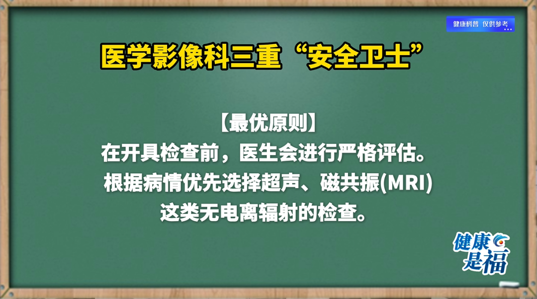 1.【最优原则】:在开具检查前,医生会进行严格评估。根据病情优先选择超声、磁共振(MRI)这类无电离辐射的检查。