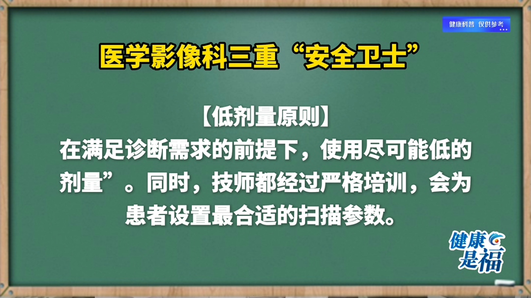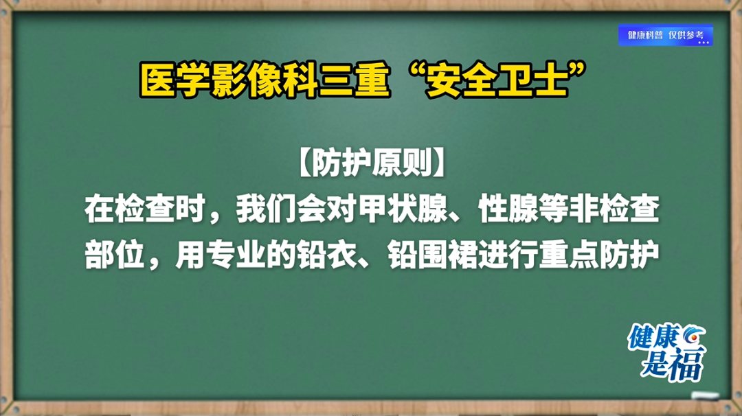 施建伟医生:刚才刘振红医生已经为大家详细地介绍了x线辐射的知识。请大家放心,为患者提供安全的检查,是我们医学影像科工作的最高准则。我们有三重“安全卫士”为您保驾护航: