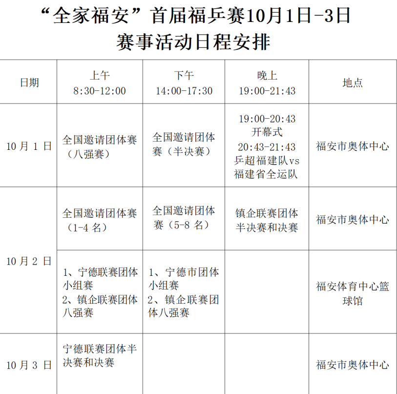 连续3天,赛事激烈!乒超福建福安队VS福建省队表演赛、全国8支省级代表队邀请赛、宁德市县市区联赛、福安镇企联赛总决赛,各场赛事将在这3天激烈开展。