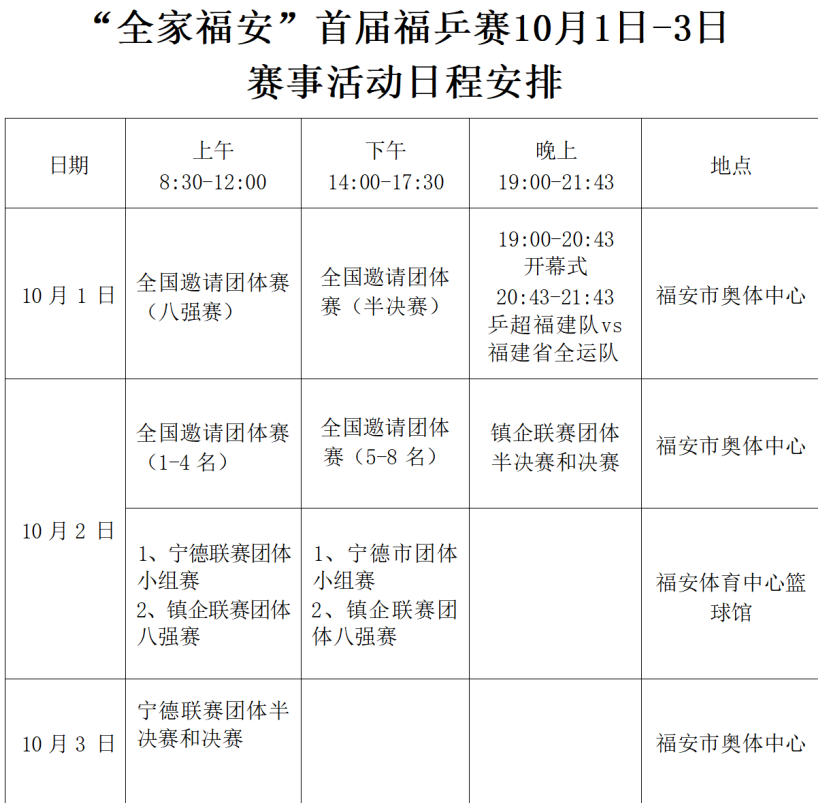 真正的乒乓盛宴,才刚刚拉开序幕!据悉,10月1日-3日,“全家福安” 首届福乒赛总决赛开幕式将在福安市奥体中心举行。