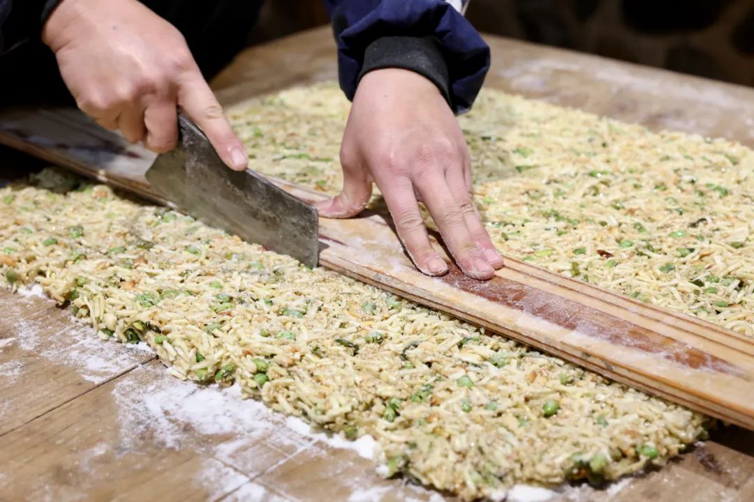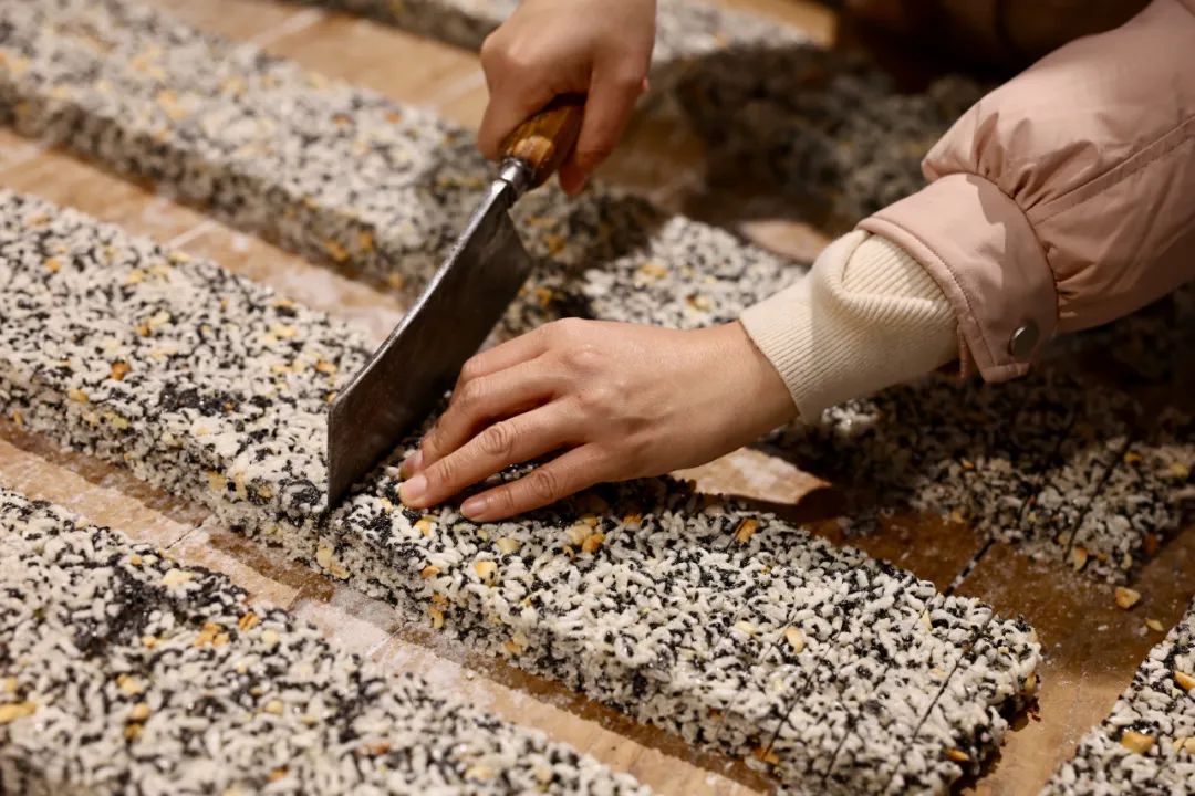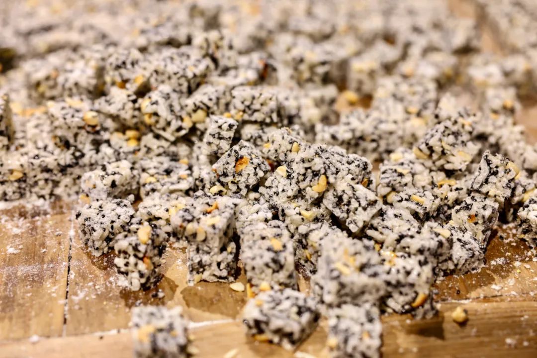 谈及糖香起年味,炒米糖是福安人的最爱。顾名思义,炒米糖就是把炒米丢到熬成金黄色的糖浆中,加入葱、盐巴、芝麻、花生等香味浓郁的果仁,搅拌均匀后整形切块成糖。这种福安话叫“米稜”的年节食品,风味不甜不腻,非常有嚼头;不软,是比较硬质一点的口感。米稜,一直以来都是福安长辈们“压箱底”的过年零食。千百年来,炒米糖的制作工艺虽然在不断提升,口味也在逐渐增多,但那浓浓的年味、人情味一直不变。