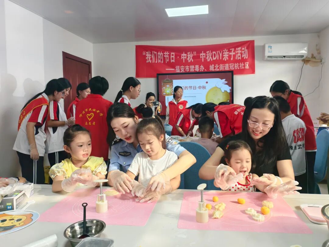 近日,福安市城北街道冠杭社区联合挂钩单位福安市委政法委、福安市禁毒大队、宁德市民族中学开展在辖区红色驿站举办“中秋月饼DIY亲子活动暨禁毒宣传活动”。活动吸引了辖区多组家庭踊跃参与,现场欢声笑语不断,大家在团圆温馨的节日氛围中,共度佳节、共话安全、共筑和谐。