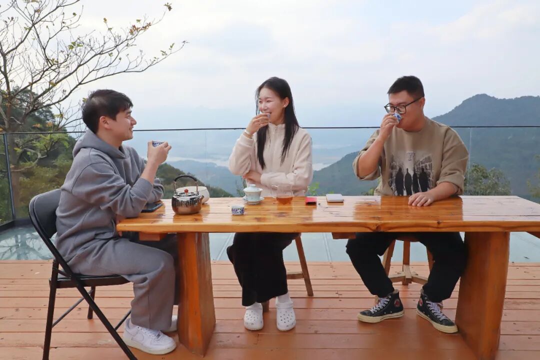 今年国庆中秋假期,“680生态康养区”接待游客超3万人次。其中,位于郭厝坪村白莲山上的福建省林鸿茂茶业有限公司茶基地成为许多游客必去的打卡点之一。玻璃观景台、错落而建的木屋、搭建好的天幕帐篷,还有秋千、栈道、凉亭……不管站在哪里拍照,都极为“出片”。