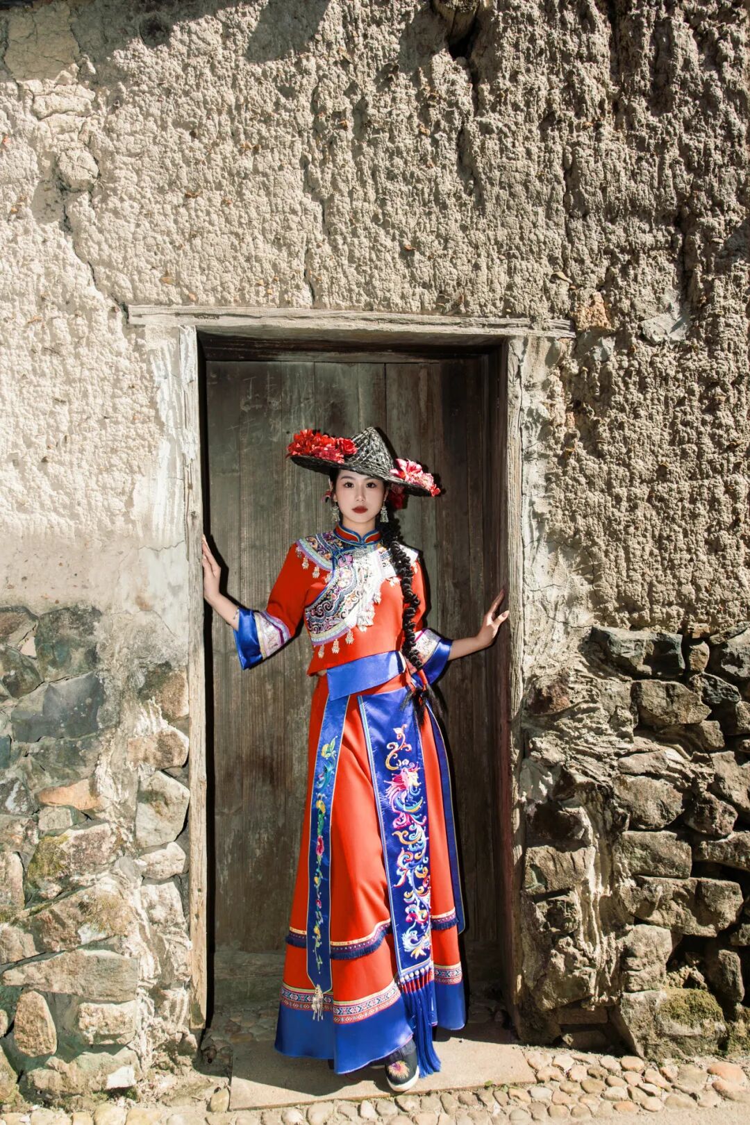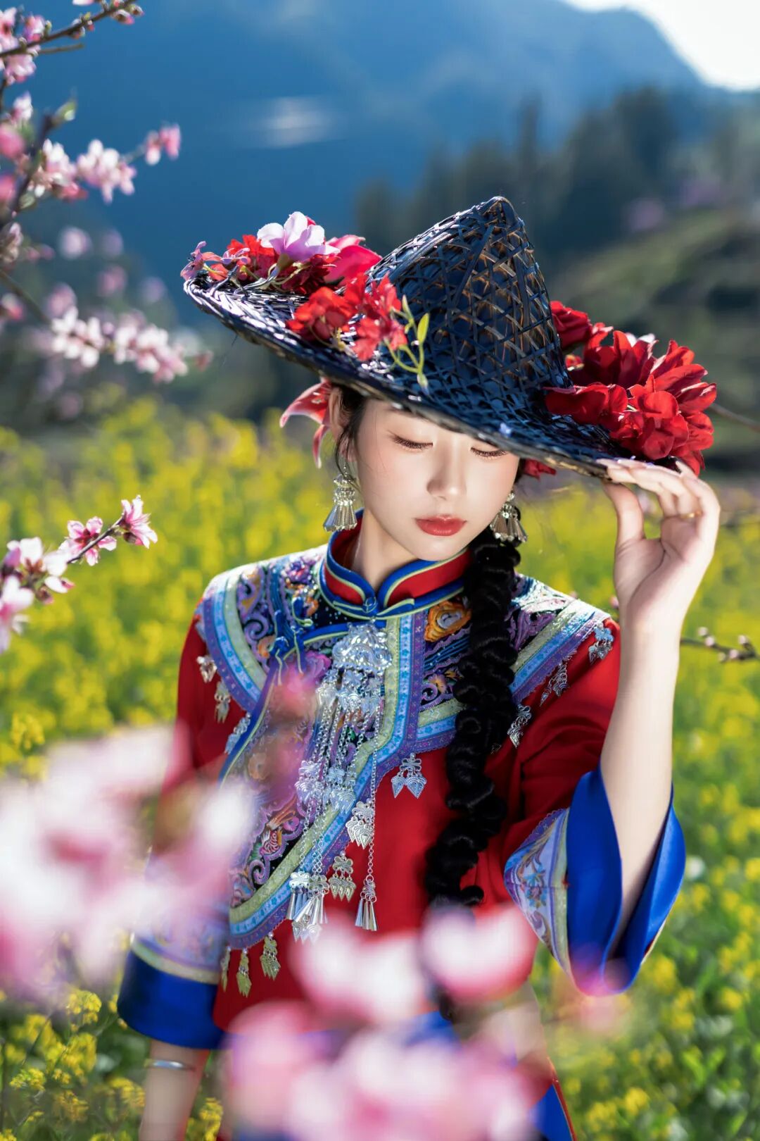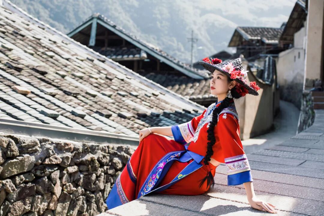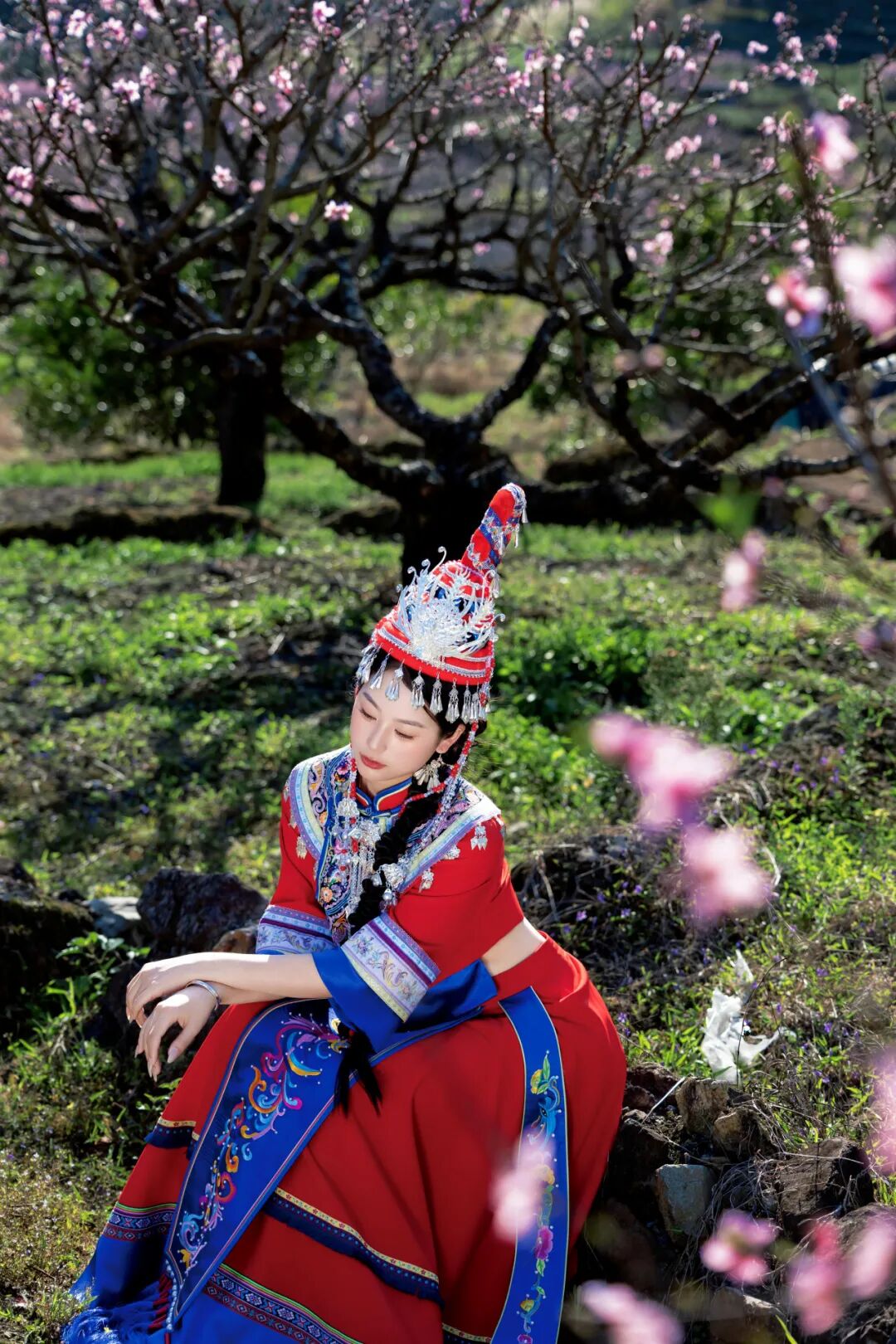 身着畲族服饰的姑娘坐在溪畔桃树下