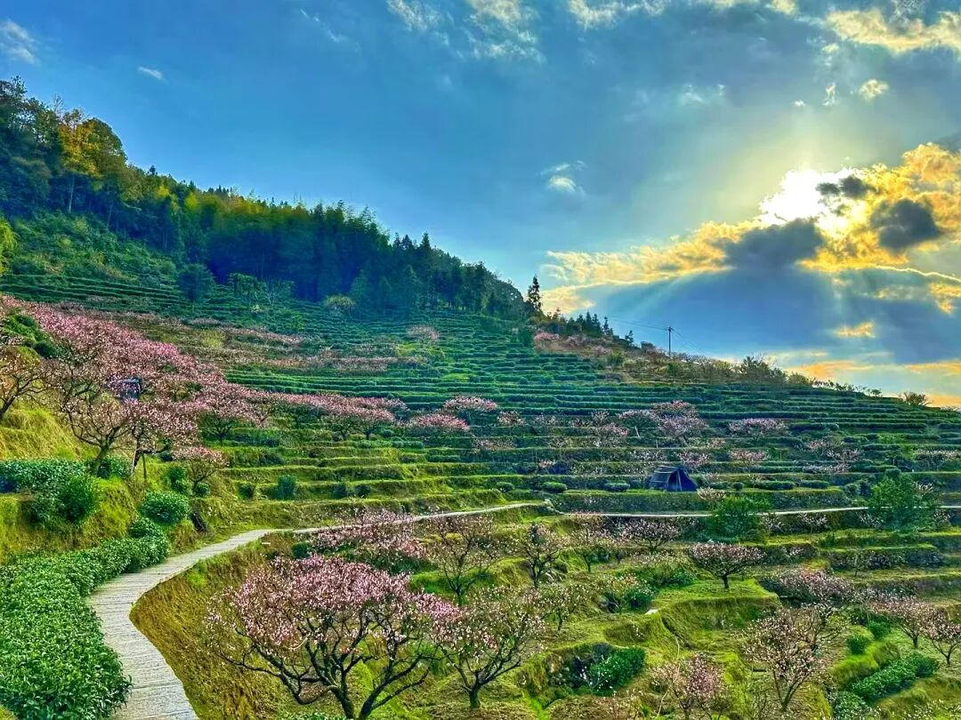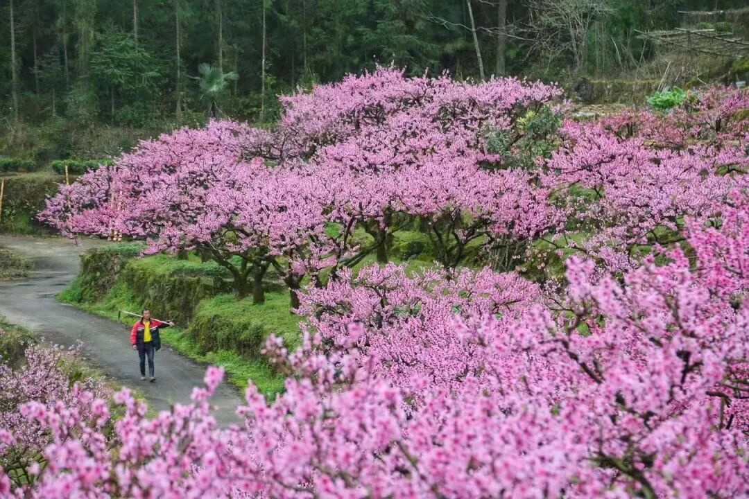 桃花开得温婉而热烈,蜿蜒的山间小路旁
