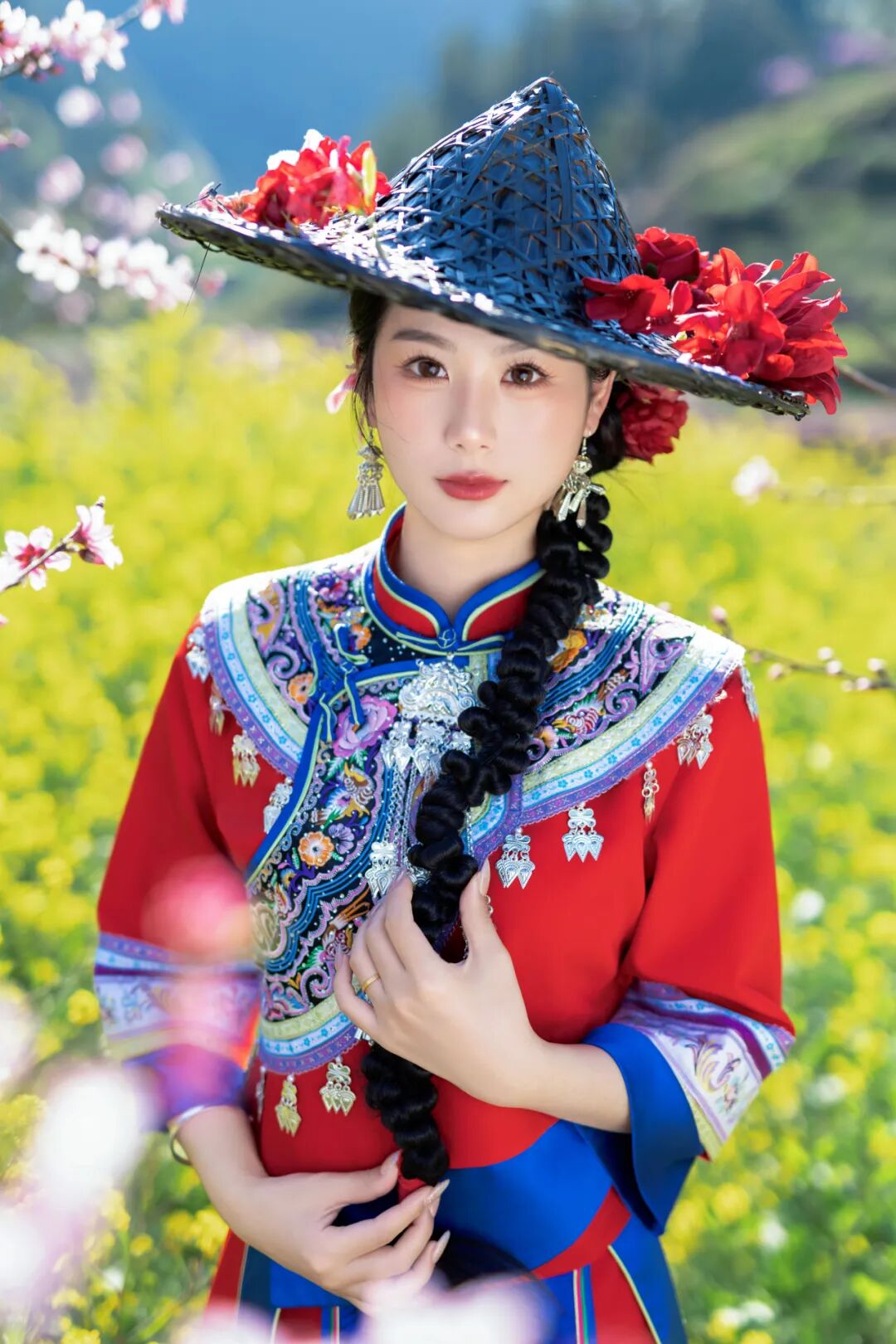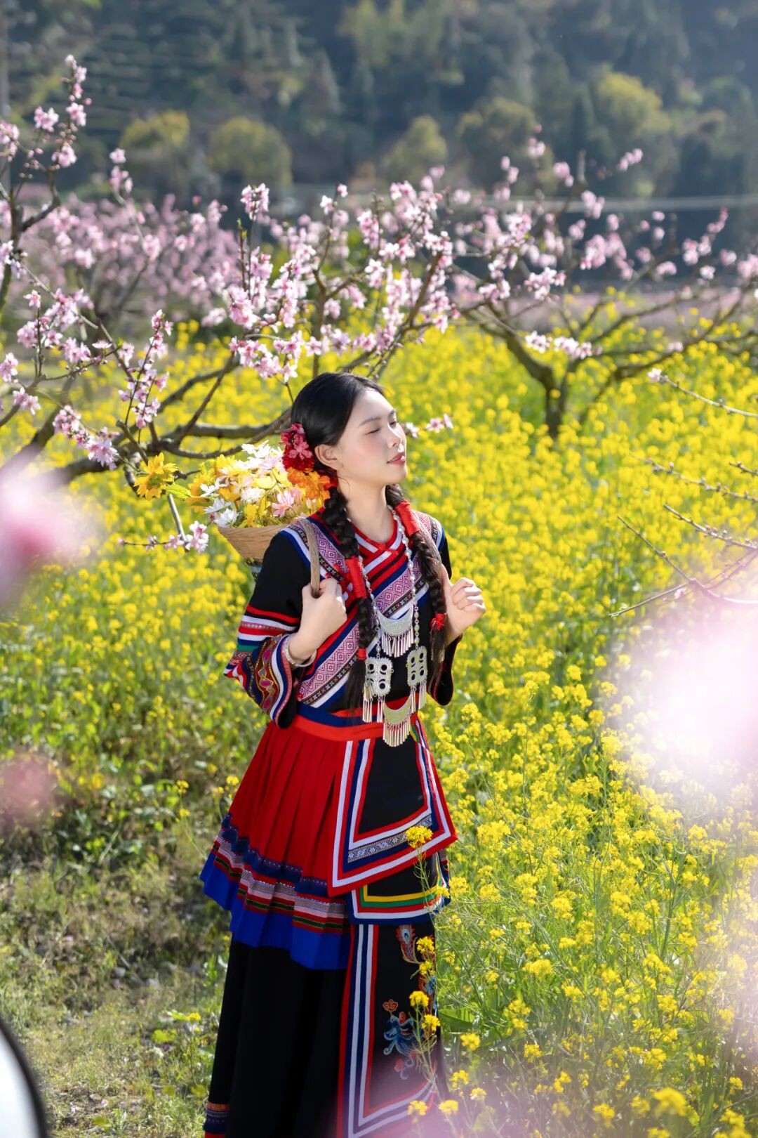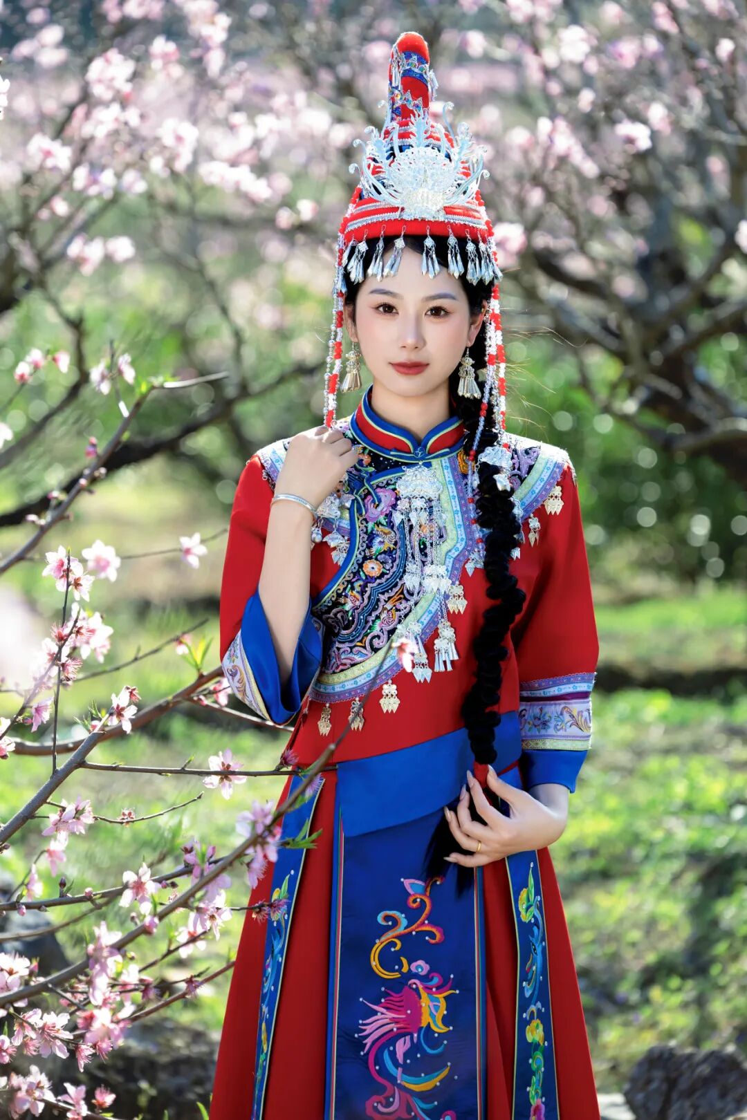 彩虹式花襟的蓝、红、绿三色与桃花碧水相互映衬,银饰碰撞发出清脆声响