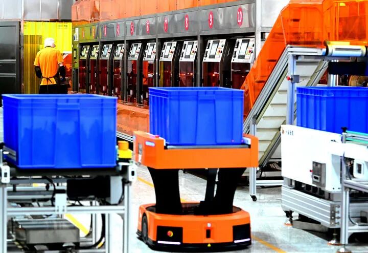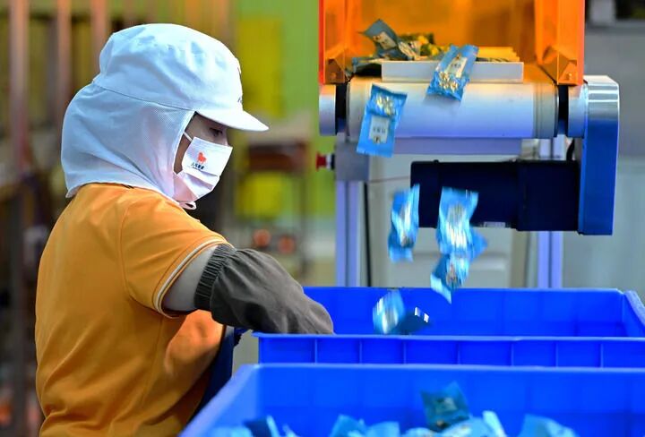 在福建八马茶业安溪总工厂的第六代铁观音智能化精制生产线上,一名工人在收整下线的铁观音成品茶(2024年5月8日摄)。新华社记者 魏培全 摄