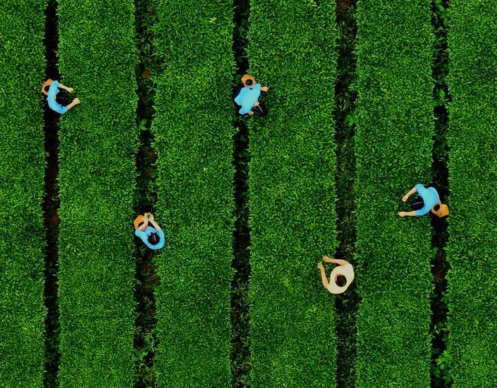 在安溪县西坪镇珠洋村八马红星茶场,茶农在茶园里采收茶叶(2024年5月9日摄,无人机照片)。新华社记者 魏培全 摄