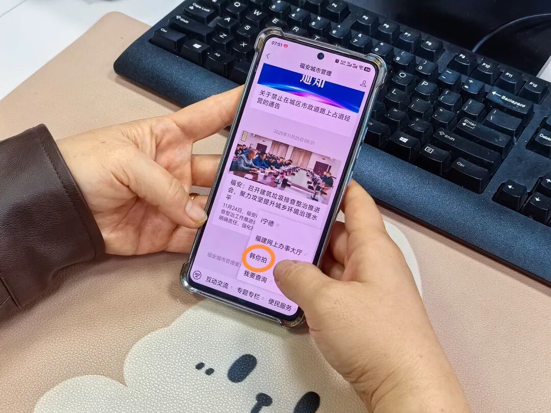 参与方式就是如此简单!关注“福安城市管理”微信公众号,点击“韩你拍”功能,按照提示拍照、描述、定位,即可提交。提醒您:拍照时请注意“远近结合”——远景看清环境,近景突出细节,便于我们快速精准处置。