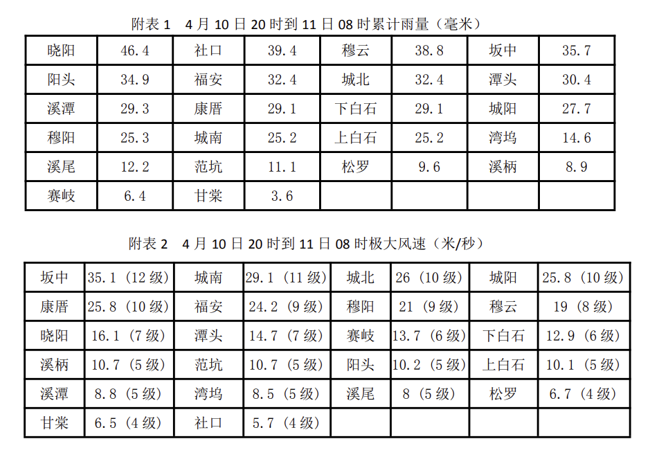 统计2026年4月10日20时到11日08时天气实况,累计雨量共有15个乡(镇、街道)超过25毫米,其中以晓阳镇46.4毫米为最大(附表1);极大风速共有8个乡(镇、街道)超过17.2米/秒(8级),其中5个乡(镇、街道)超过24.5米/秒(10级),其中以坂中乡35.1 米/秒(12级)为最大(附表2)。