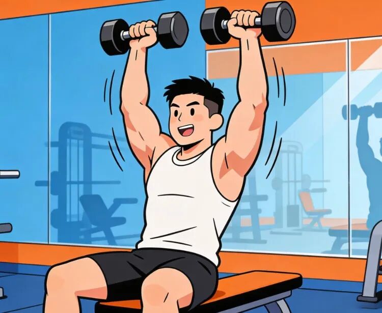 坐或站立,双手持哑铃或水瓶举至肩高,掌心向前,向上推至头顶直至肘部最终伸直,缓慢放下。