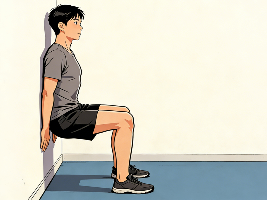 背靠墙壁,双脚与肩同宽,脚尖朝前,脚跟离墙约一脚半的距离。沿墙壁缓慢向下滑动,直到大腿与地面平行。注意保持腰背紧贴墙壁,膝盖与脚尖方向一致,不要内扣。