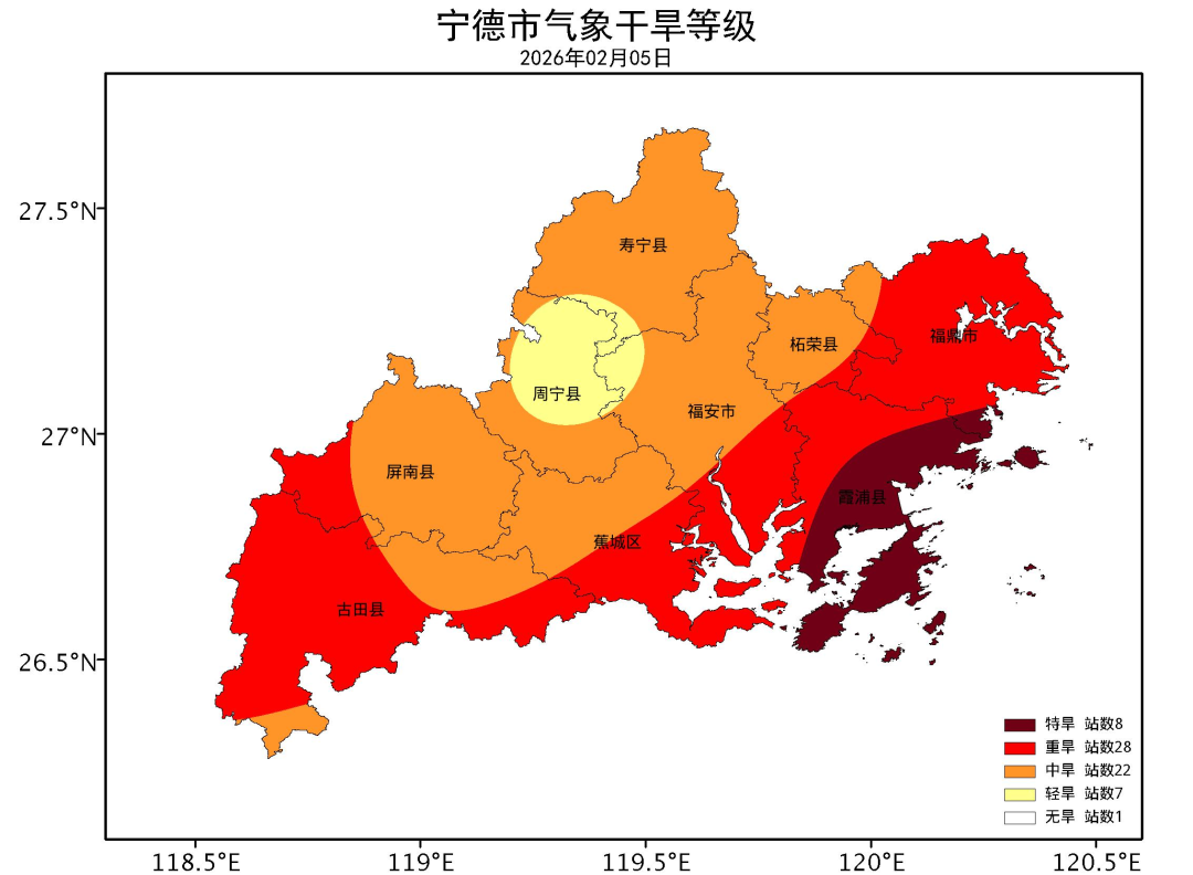 2025年12月1日以来,我市累计降水量25.9毫米,较常年同期 126.4毫米偏少79.5%;近10天我市平均相对湿度81.2%,各乡镇均出现不同程度气象干旱,其中沿海地区达重旱(见附图)。
