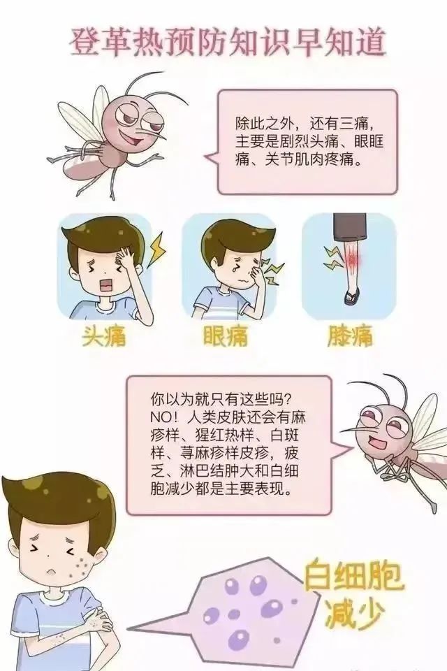 2、除发烧外,登革热患者常伴有骨头痛、头痛、肌肉痛,以及皮疹、出血点,有的患者还可能有拉肚子、肚子痛等消化道症状。