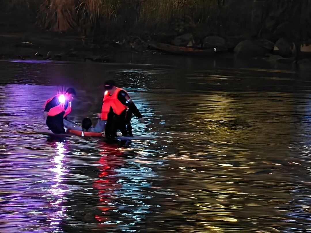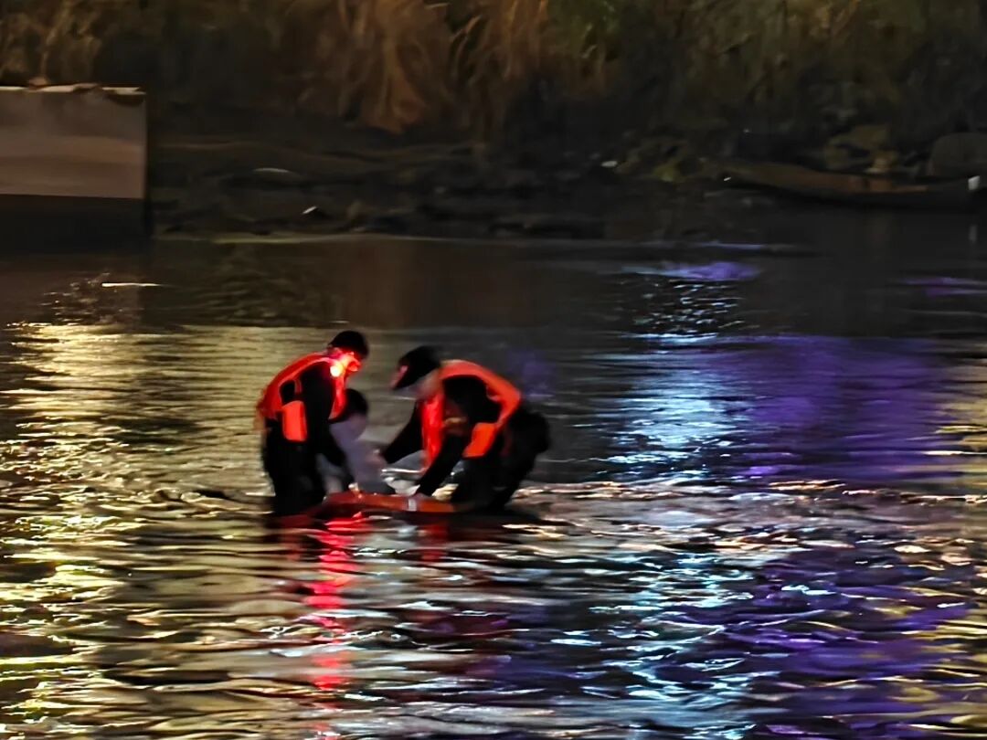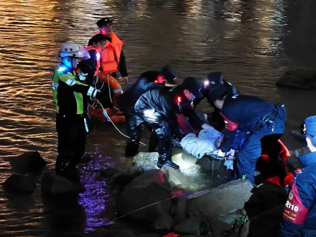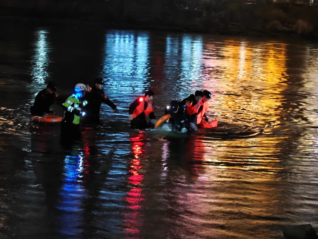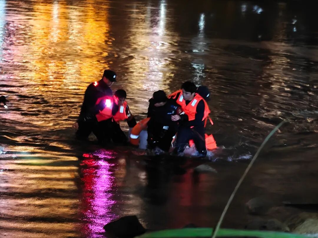 轻生男子因体力不支坠入冰冷河中。民警辅警临危不乱、高效联动:桥上队员用强光手电精准照明,锁定救援方位;桥下队员携带救生圈、救生绳义无反顾跃入水中;岸上警力紧握救生绳,水陆协同、紧密配合,快速为落水男子固定救生设施,合力将其安全营救上岸。