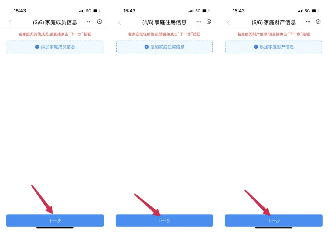 若有其他家庭成员信息、家庭住房信息、家庭财产信息的需要按照系统要求进行添加后保存,若无则点击下一步即可。