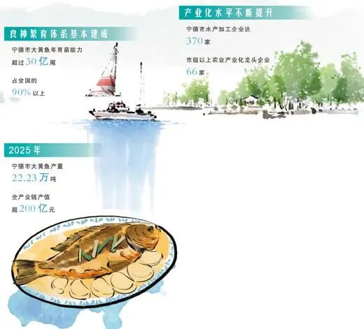 从捕捞到养殖,从养殖到加工,从渔业生产到文旅经济,“海上黄金”成为串联起一二三产业融合发展的“金纽带”。2025年,宁德市大黄鱼产量22.23万吨,直接或间接带动了宁德数十万劳动力就业创业,成为闽东沿海百姓增收致富的支柱产业。
