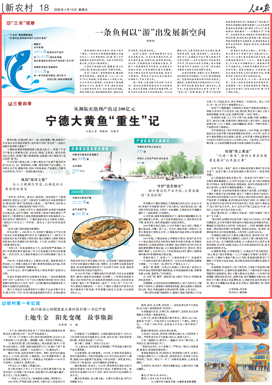4月10日,人民日报新农村版“三餐四季”专栏刊发通讯《宁德大黄鱼“重生”记》,并配发评论《一条鱼何以“游”出发展新空间》。中国大黄鱼之都——福建宁德,让大黄鱼种群从岌岌可危、濒临灭绝,到如今群鱼逐浪、产业新生,大黄鱼全产业链产值已经突破200亿元。