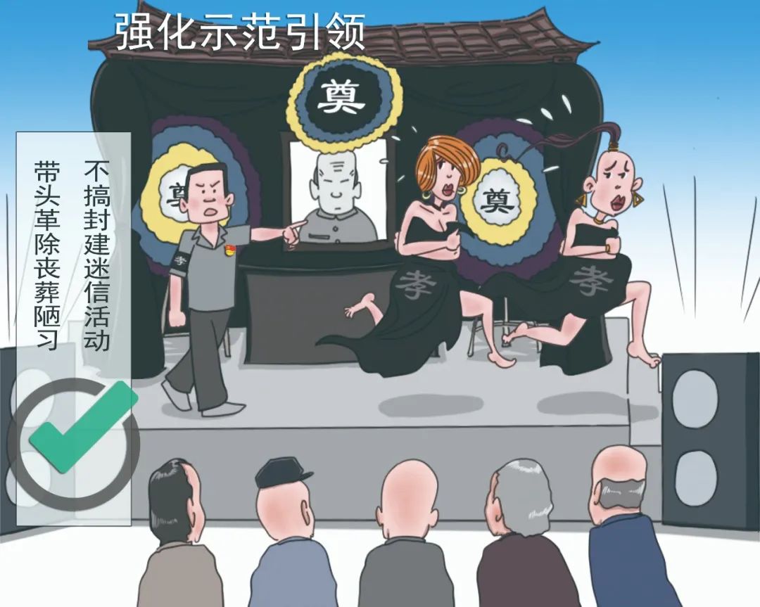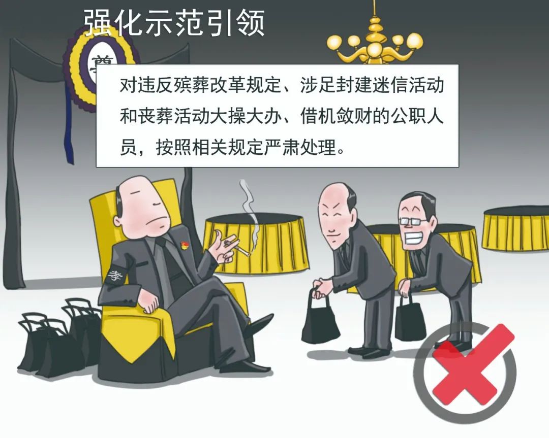 (四)带头宣传倡导殡葬改革,弘扬新风正气。党员、干部要积极主动宣传殡葬改革,加强对亲属、朋友和周围群众的教育引导,及时劝阻不良治丧行为,自觉抵制陈规陋俗和封建迷信活动,倡导文明新风。各级领导干部要加强对直系亲属和身边工作人员丧事活动的约束,积极做好思想疏导工作,对不良倾向和苗头性问题,要做到早提醒、早制止、早纠正,决不允许对违法违规殡葬行为听之任之甚至包庇纵容。