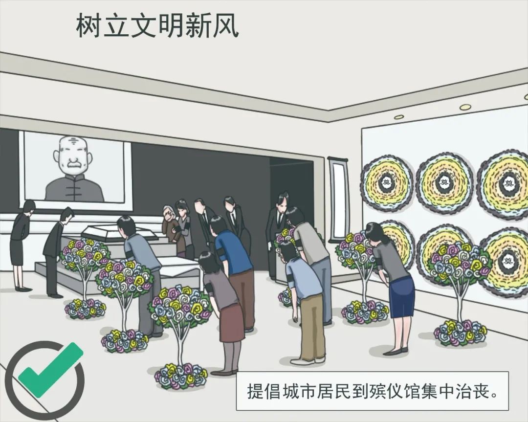 (一)带头文明节俭办丧事,树立时代风尚。党员、干部应当带头文明治丧,简办丧事。要在殡仪馆或合适场所集中办理丧事活动,自觉遵守公共秩序,尊重他人合法权益,不得在居民区、城区街道、公共场所搭建灵棚。采用佩戴黑纱白花、播放哀乐、发放生平等方式哀悼逝者,自觉抵制迷信低俗活动。除国家另有规定外,党员、干部去世后一般不成立治丧机构,不召开追悼会。举行遗体送别仪式的,要严格控制规模,力求节约简朴。对于逝者生前有丧事从简愿望或要求的,家属、亲友以及所在单位应当予以充分尊重和支持。严禁党员、干部特别是领导干部在丧事活动中大操大办、铺张浪费,严禁借机收敛钱财。