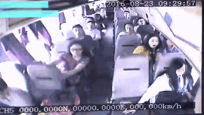 (▲乘坐公交车、大客车未系安全带,乘客被甩出车外)
