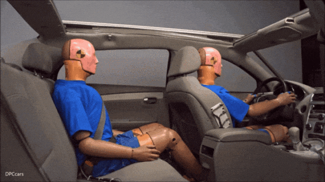 (▲模拟碰撞实验,把几个假人放置在车内,在没有系安全带的情况下,假人飞了出去)
