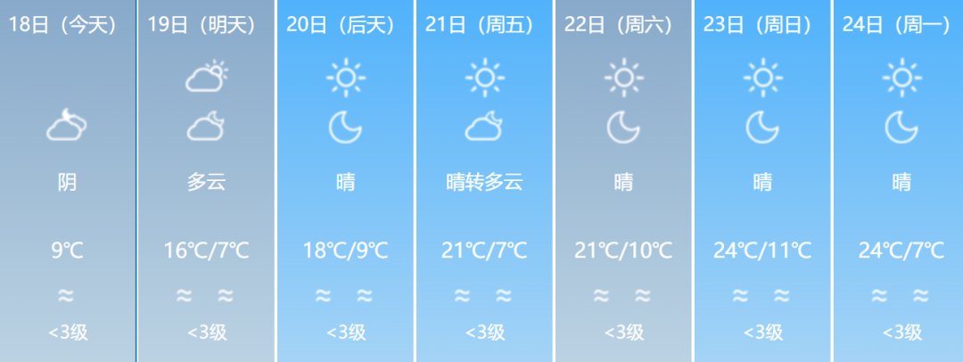 11月19日:阴转多云。偏北风3~4级,沿海偏北风5~6级,阵风7~8级。火险2级,可燃。气温8~16℃。